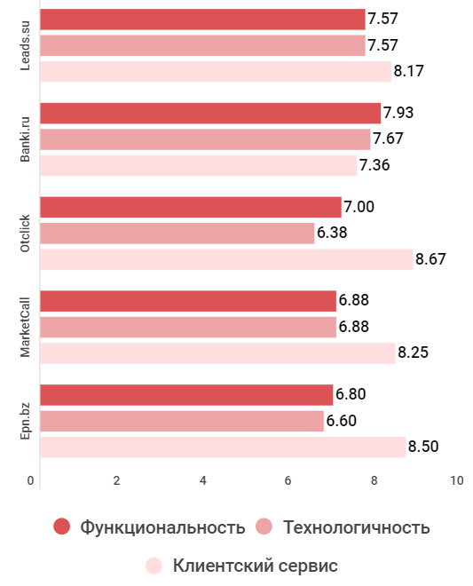 Как и в рассмотренных выше сегментах, здесь общий балл за качество компании набрали в основном за клиентский сервис, за исключением Banki.ru (второе место). Средняя оценка качества невелика и даже у лидера Leads.su не дошла до восьми баллов. У компаний на 3-5 местах оценка за эффективность и технологичность в основном менее семи баллов.