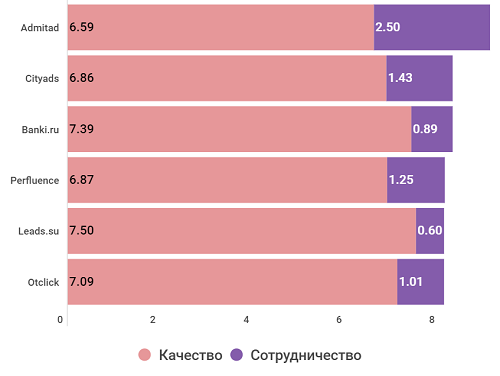 В интегральном рейтинге победил Admitad - при не самом высоком среднем балле за качество компания выиграла за счет большой доли сотрудничества. Схожая картина у Cityads (второе место) и у Perfluence (четвертое место). У Banki.ru и Leads.su (третье и пятое места) все наоборот - с ними работают не так много компаний, но качество их услуг заказчики оценивают довольно высоко.