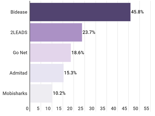 В сегменте сетей мобильной видеорекламы даже у лидера Bidease доля сотрудничества не дотягивает до половины опрошенных фирм-заказчиков. Следующую за ним компанию Yabbi назвали менее трети клиентов, а компании на 3-5 местах не набрали доля не достигла и 25%.
