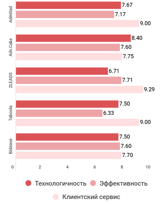 В рейтинге качества ровной картины нет ни у одного из лидеров, кроме Bidease (5 место). Занявшая первое место Admitad демонстрирует средние показатели технологичности и эффективности, но высокий уровень клиентского сервиса. На втором месте AdvCake, чьи технологичность и эффективность, по мнению заказчиков, самые высокие из всех участвующих в рейтинге компаний, но хромает клиентский сервис. А у 2Leads (3 место) очень хороший клиентский сервис, но низкий уровень технологичности. Эффективность ниже всего у Taboola, и войти в ТОП-5 компания сумела лишь благодаря хорошему клиентскому сервису. В целом средняя оценка за качество даже у лидеров этого сегмента невысока и не доходит до восьми баллов.