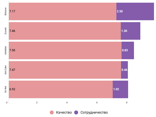 В этом сегменте интегральный рейтинг неровный - лидер Bidease опережает следующую компанию почти на целый балл, при этом выигрывает не за счет качества, а за счет большой доли сотрудничества. И наоборот - выше всех качество работы клиенты оценили у Admitad, но из-за не самой высокой доли сотрудничества компания заняла лишь третье место. В целом разница показателей у лидера и у замыкающей ТОП-5 компании Go Net свыше полутора баллов.