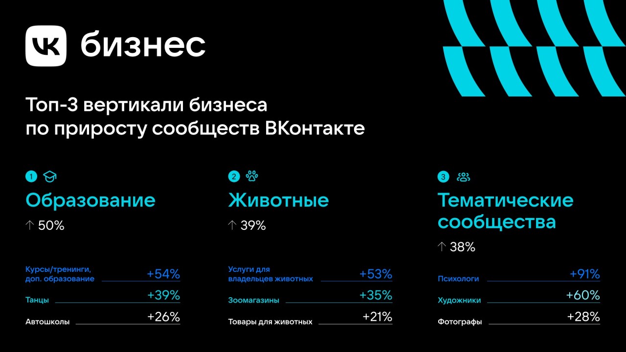 Самыми быстрорастущими регионами по количеству предпринимателей во«ВКонтакте» стали Москва, Cочи и Екатеринбург — число бизнес-сообществ в нихувеличилось на 29, 28 и 23% соответственно. В топ-3 по приросту бизнеса вошлисообщества с фокусом на образовании, заботе о животных и тематическиесообщества — их число выросло на 50, 39 и 38%.