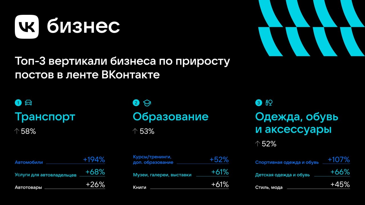 В июле 2023 г. число предпринимателей, которые ведут бизнес во «ВКонтакте»,выросло на 25% год к году. Они разместили на 36% больше постов в ленте.Пользователи на 22% чаще взаимодействовали с бизнес-сообществами: переходили накарточки товаров и услуг, создавали заказы, писали сообщения и звонили зауточнением деталей, сообщила пресс-служба соцсети.