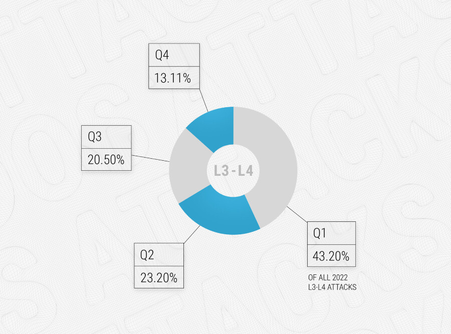 Общее число DDoS-атак в мире увеличилось на 73,09% в 2022 г. к 2021 г. Вначале прошлого года большинство атак были базовыми, но в последние три месяцауровень нападений стал сложнее, следует из отчета компании. В первом квартале2022 г. доля DDoS-атак составила 43,2%, в следующие три месяца динамикахакерских нападений начала снижаться: их процент был равен 23,3%, в третьемквартале — 20,5%. С октября по декабрь значение уменьшилось до 13,11%.