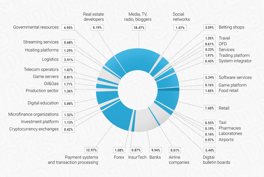 Хакерские атаки чаще всего направлялись на СМИ, банки и платежные системы в2022 г. Об этом говорится в результатах исследования компании Qrator Labs. Так,18,5% от общего количества DDoS-атак пришлось на СМИ, 13% — на платежныесистемы, 9,9% — на банки.