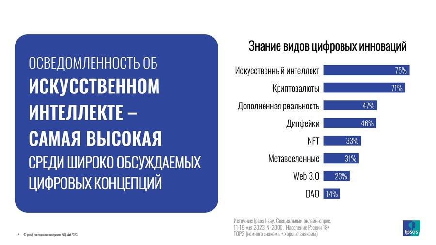 Про искусственный интеллект знают 75% россиян, следует изрезультатов опроса исследовательской компании Ipsos, проведенного в мае 2023 г.среди 2 тыс. россиян старше 18 лет. На втором месте по осведомленностиоказалась криптовалюта (знают 71% респондентов), третье место с большим отрывомзанимает дополненная реальность (47%).