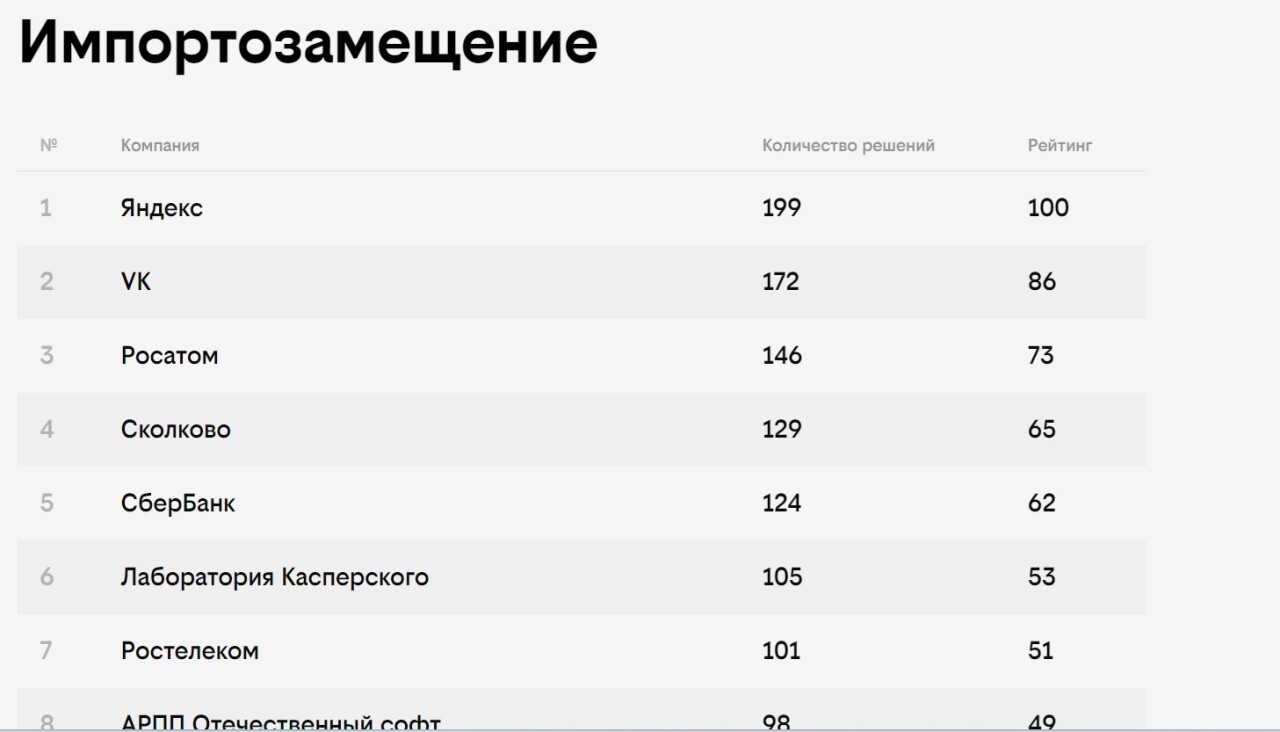 В каждой основной категории нейросеть определила топ-50 компаний. Вбольшинстве номинаций в топ-3 попали «Яндекс», VK и «Сбер». В категории «Ретейли ИИ» лидерами стали «Магнит», Ozon и Wildberries, в телекоме — МТС, «билайн» и«МегаФон», среди банков первые места заняли «Сбер», ВТБ и «Тинькофф».