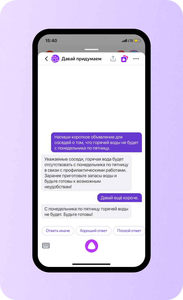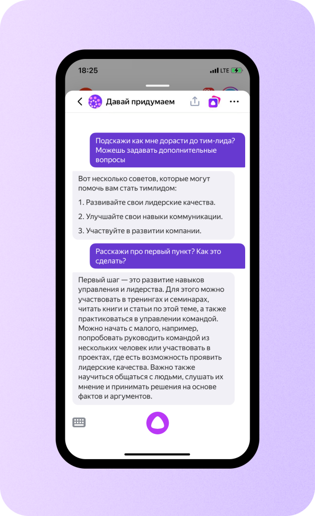 Благодаря поддержке контекста у «Алисы» можно уточнить свой запрос, неповторяя его целиком. По просьбе пользователя голосовой помощник со встроеннойнейросетью может дать совет, выступить в роли делового партнера илисоавтора.