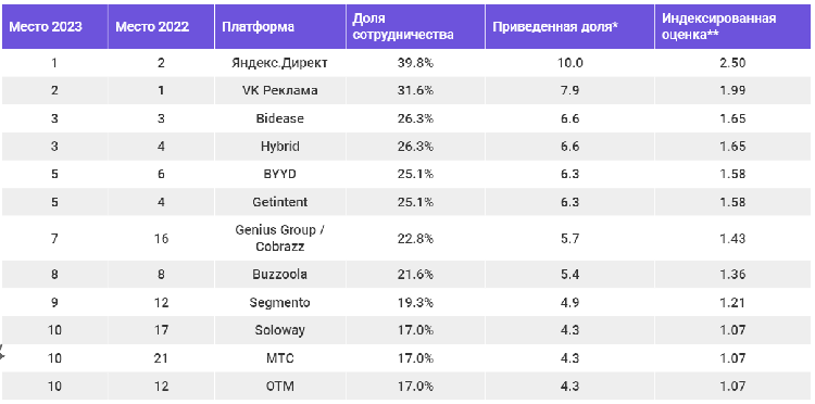 Первые два места заняли платформы, не участвовавшие в рейтинге 2022 года:AdRiver и Programmatica. Замыкает тройку лидеров Adspend, снизившись посравнению с 2022 годом на одну позицию.