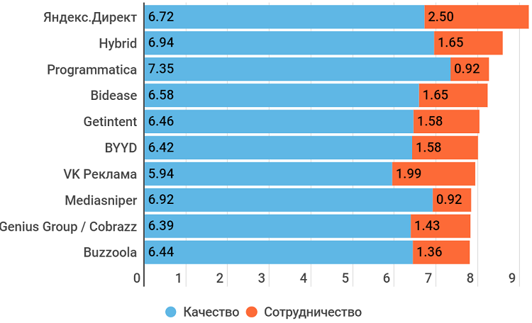 Первое место в интегральном рейтинге заняла компания Яндекс.Директ за счетуверенного лидерства по доле сотрудничества. За ней следует Hybrid, здесьхорошая позиция объясняется высоким баллом за качество. Третье место уProgrammatica, которая тоже смогла войти в ТОП-3 за счет высокого качества дажепри низкой доле сотрудничества. Та же картина у Mediasniper, у нее оценка закачество приближается к 7 баллам.