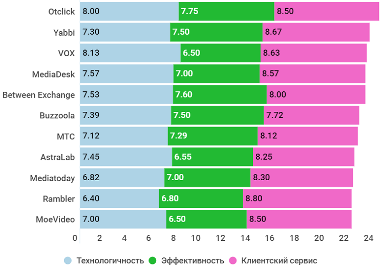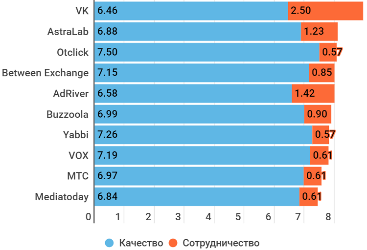 Лидер интегрального рейтинга компания VK завоевала свое место благодарявысокой доле сотрудничества, а оказавшаяся на третьем месте Otclick наоборот -при маленькой доле сотрудничества у нее высокий балл за качество. Кроме нее засчет высокого качества в ТОП-10 смогли войти Between Exchange,Yabbi и VOX.