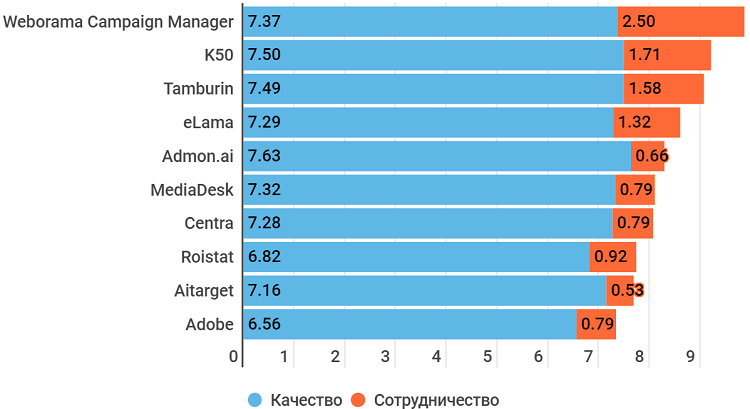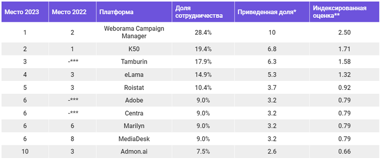 Два лидера прошлогоднего рейтинга Weborama Campaign Manager и K50 поменялисьместами, теперь лидирует первая. На третьем месте новый участник Tamburin.Кроме него, в 2022 году не изучались вошедшие в актуальный рейтинг Centra иAdobe.