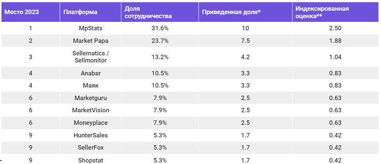 В этом сегменте показатели доли сотрудничества у всех участников рейтинганевелики. Первое место заняла компания MpStats, на втором оказалась MarketPapa, и замыкает тройку лидеров Sellematics / Sellmonitor. Все три лидера идутс довольно значительным (около 10%) отрывом друг от друга.