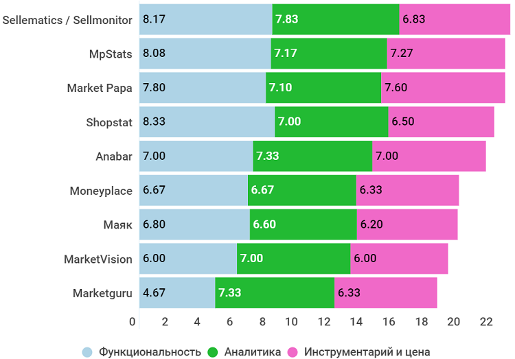 В целом средние баллы за качество у компаний этого сегмента невелики и недостигают 8 баллов. Первое место досталось Sellematics / Sellmonitor, второе -MpStats, на третьем Market Papa.