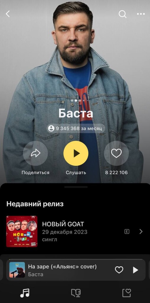 Основным фактором его лидерства на сервисе стали прослушивания трека «Назаре» — кавера Басты на песню группы «Альянс», который вошел в саундтрексериала «Слово пацана». За последние два месяца количество прослушиваний «Назаре» в «Моей волне» — система рекомендаций в «Музыке» — выросло более чем в 20раз. Сколько всего прослушиваний набрал трек, в компании не сообщили.