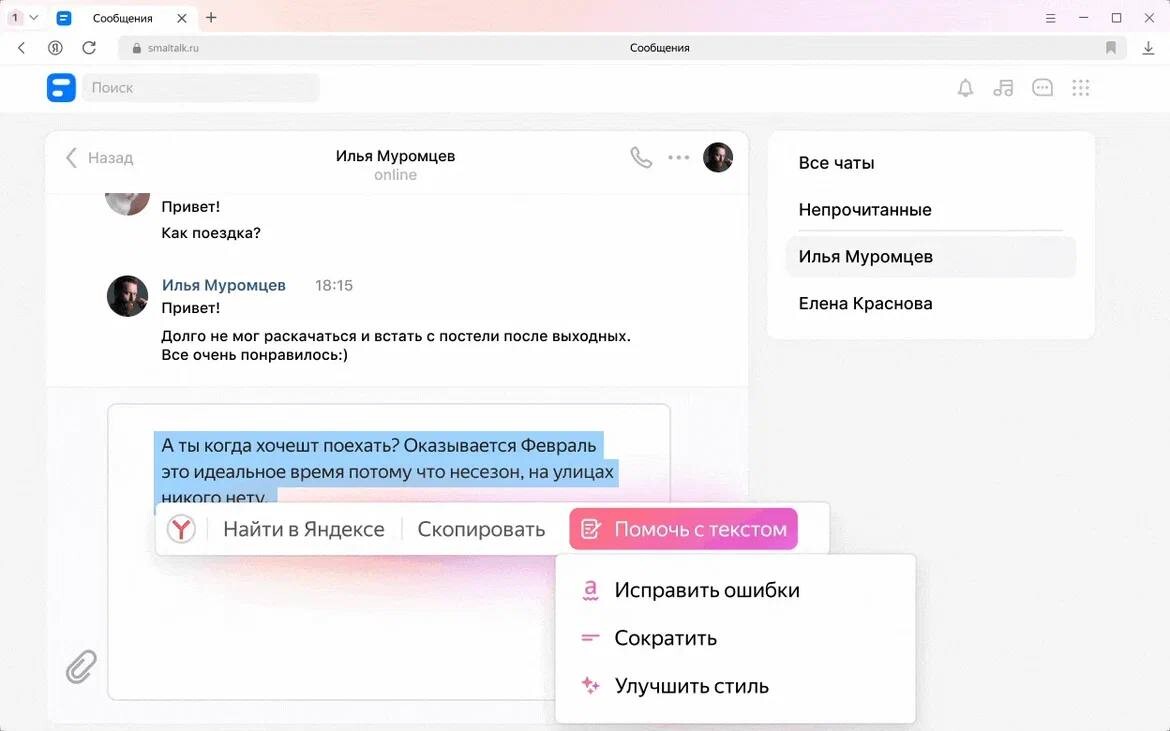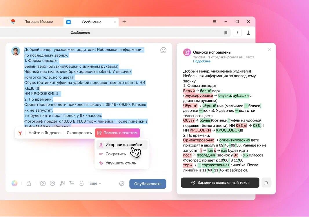 YandexGPT в нейробраузере будет отвечать за написание комментариев, писем,отзывов и других текстовых сообщений. Функция «Помочь с текстом» будет работатьв трех режимах —«Исправить ошибки», «Сократить» и «Улучшить стиль». Также вбраузере можно будет сгенерировать заголовки и картинки для постов истатей.