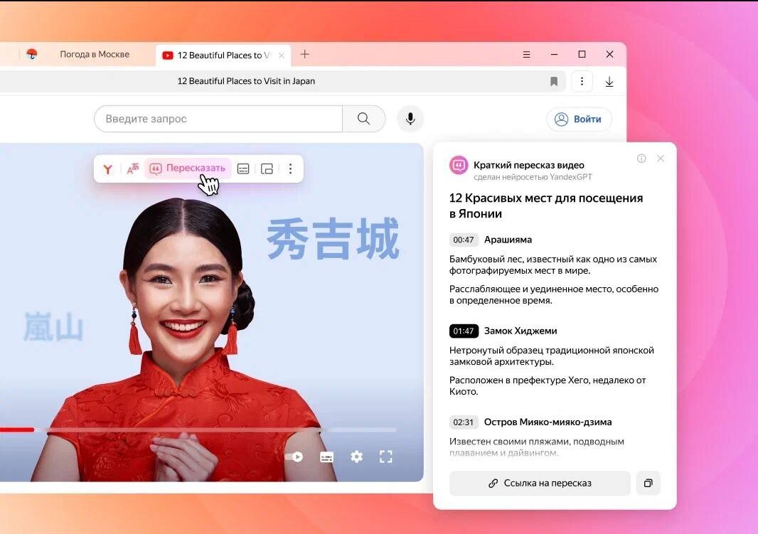 В нейросетевой перевод видео «Яндекс» внедрил два новых языка — японский икорейский. Нейробраузер будет переводить видео тезисно в формате пересказа, егоможно будет озвучить голосом «Алисы». Кроме того, нейробраузер сможет открыватьQR-коды с экрана видео.