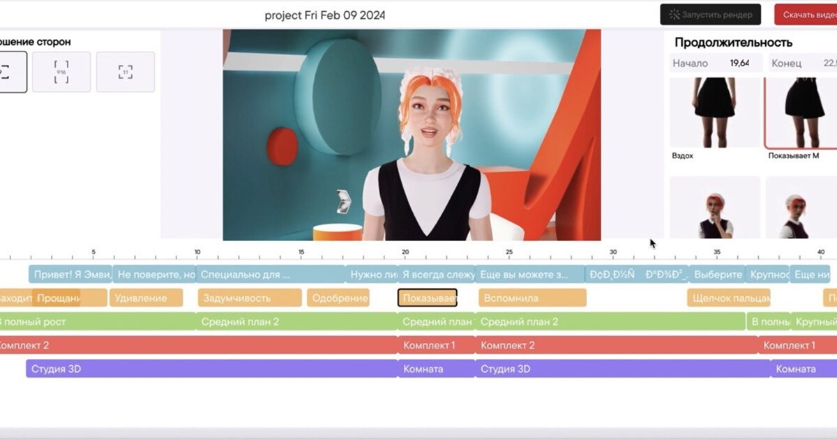 Сервис дает возможность создавать речь, мимику, жесты, внешний видперсонажа, выстраивать кадр — ракурс и масштаб, менять фон и освещение длясоздания контента. Программой можно пользоваться через браузер.