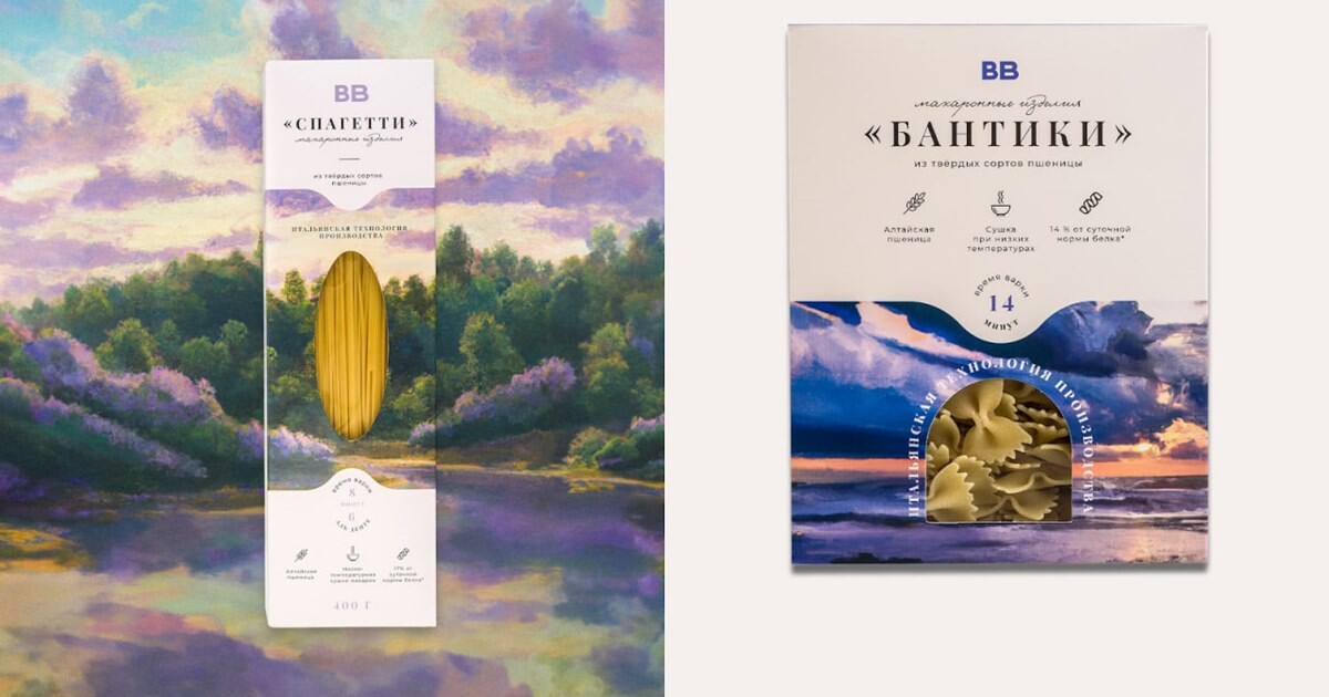 Запрос для генерации картины позиции макаронные изделия «Бантики» содержалследующее описание: «Пейзаж в фиолетово-синих тонах. Голубые тучи и спокойноеморе. Сумеречная атмосфера после дождя. Солнце немного проступает сквозьоблака. На переднем плане небольшие камни, о которые разбиваются волны.Безмятежность и спокойствие. Экспрессионизм».