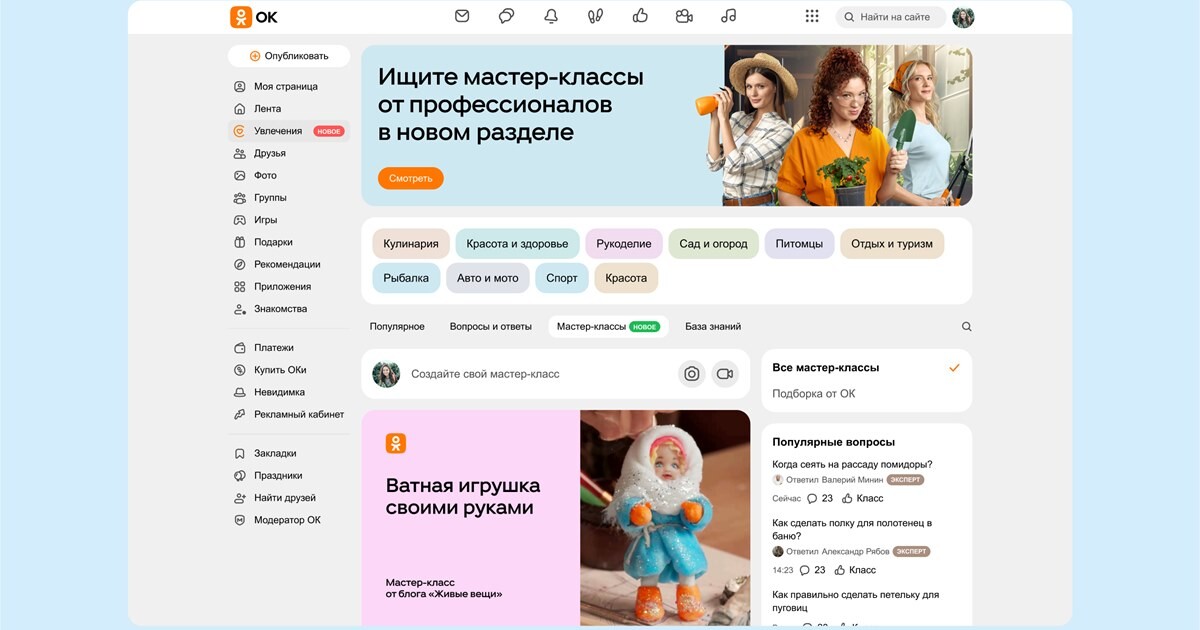 Раздел «Мастер-классы» появился в сети «Одноклассники» с новым типомконтента в соцсети, говорится в сообщении, поступившем в AdIndex. Пользователимогут проходить обучение, которое связано с различными хобби.
