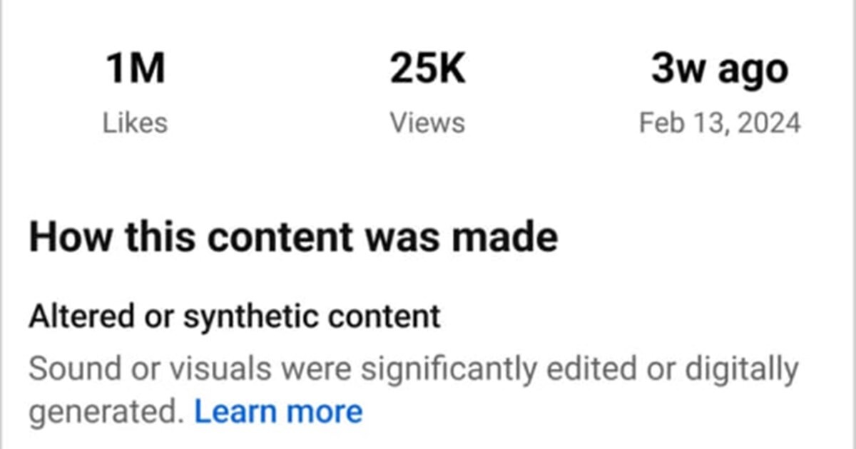 Отметка о сгенерированном контенте необходима, когда изменены лицо и голосчеловека или созданы реалистичные сцены. Например, такая маркировка будет навидео, где торнадо движется к реальному городу. Также новые правила коснутсяроликов с правдоподобными деталями: изменение реального городскогопейзажа.