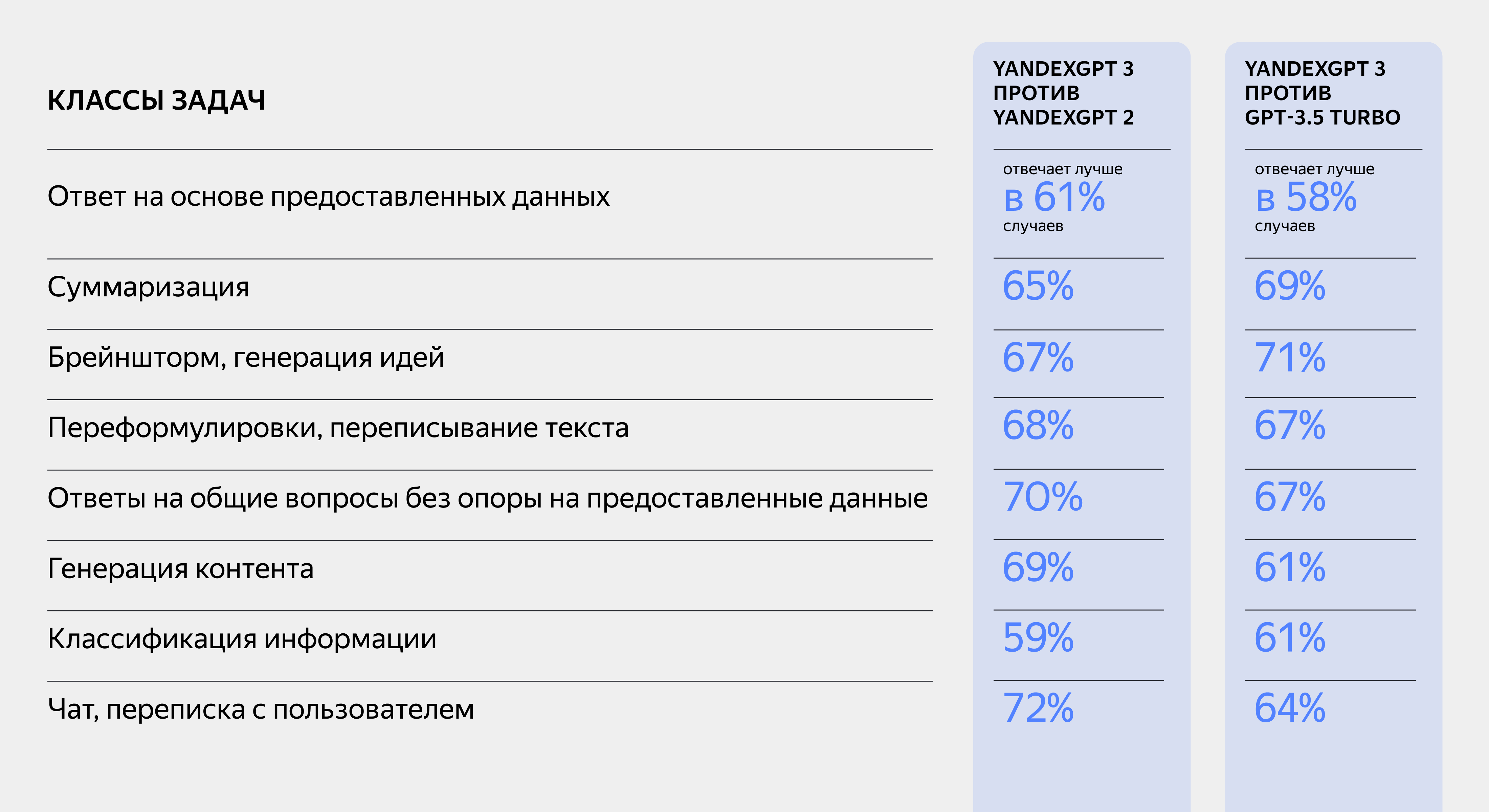 В среднем YandexGPT 3 отвечала лучше, чем YandexGPT 2, в 67% случаев. Приработе с пользовательскими запросами и обработке бизнес-запросов новаянейросеть показала результат выше в 69 и 60% случаев соответственно.