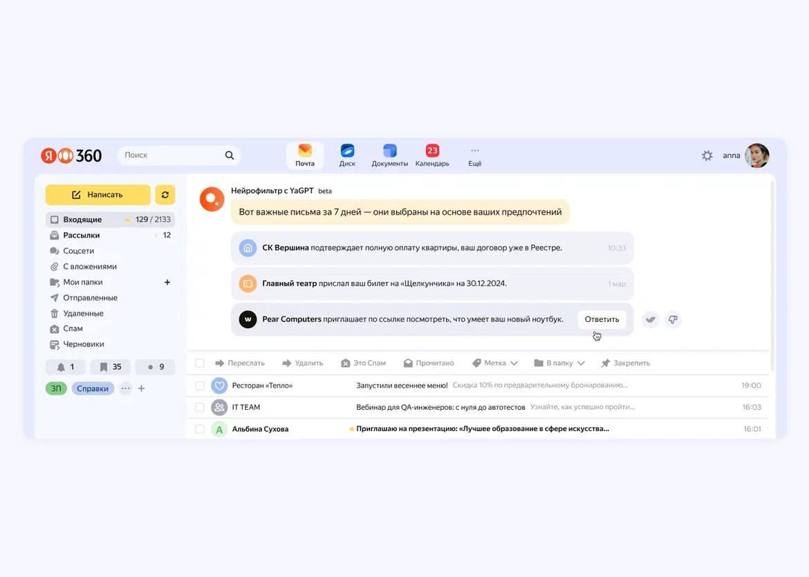 «Яндекс 360» добавил в почту нейрофильтр с YandexGPT. Это дайджест важныхвходящих писем за последнюю неделю, который составляют нейронные сети, сообщилпроджект-менеджер Антон Проценко на презентации компании.