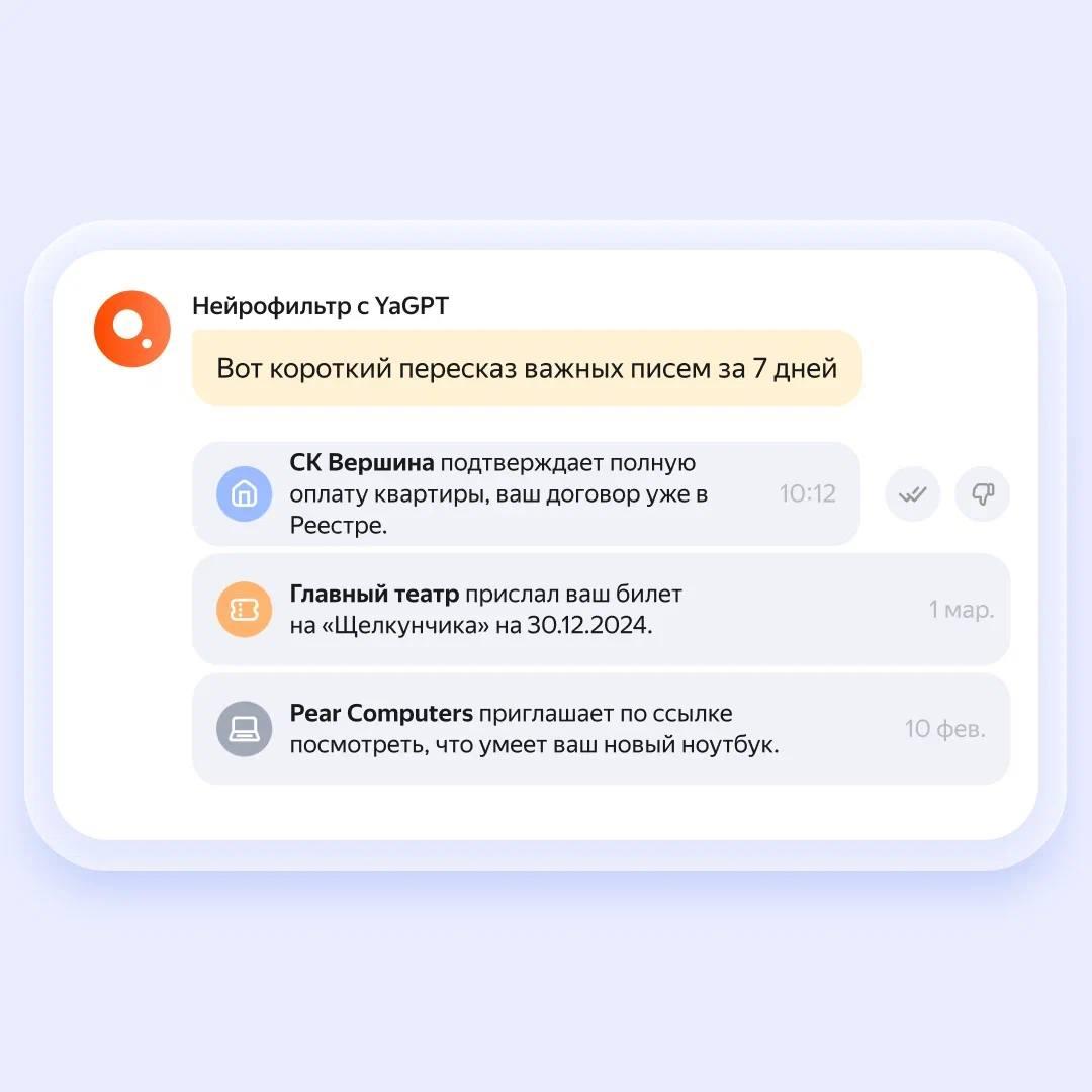 YandexGPT делает пересказ только тех писем, на которые указала«Спамооборона» у пользователей со включенной функцией. Содержимое нейрофильтраобновляется в режиме реального времени. Если какое-то из писем больше неактуально, пользователь помечает его прочитанным, и оно пропадет издайджеста.