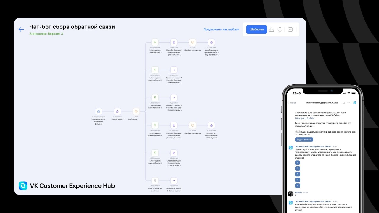 Платформа построена на базе решения для автоматизации маркетинга и работы сданными VK Customer Experience Hub. На ней доступны готовые шаблоны ивизуальный конструктор сценариев. С их помощью можно создать чат-бот дляпопулярных мессенджеров и настроить email- и SMS-рассылки для разных группклиентов. Например, нейросеть ответит на популярные вопросы, а принеобходимости переведет диалог на оператора.