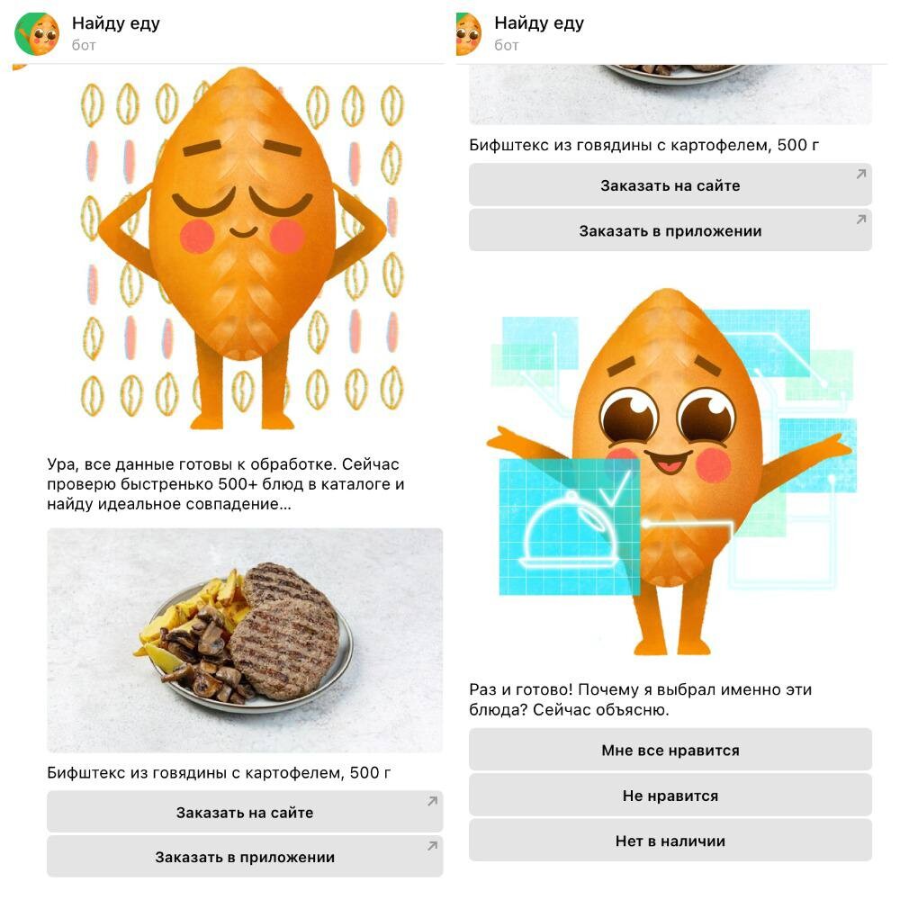 Алгоритм работы бота следующий: он задает ограниченное количество вопросовпокупателю и на основании нескольких ответов предлагает ряд блюд, после чегопользователь может оформить заказ, перейдя на сайт или в мобильное приложение.При этом у покупателя есть возможность продолжить общение с «пИИрожком» иконкретизировать свои ответы.