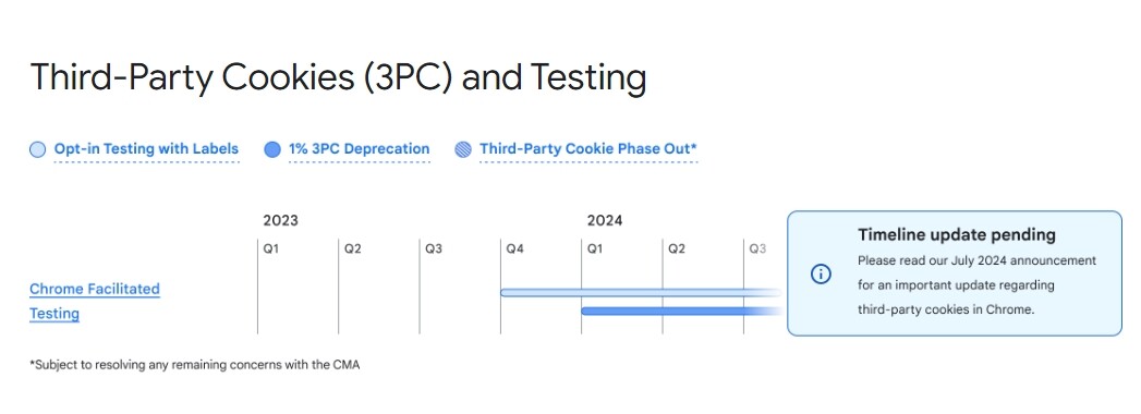 Изначальный план предполагал отказ от cookies c 2020 года в течение двухлет. Однако позднее Google начал сдвигать сроки: вначале до2023 г.,затем — до второй половины2024 г.Параллельно компания развивала технологию для Android,тестированиекоторой планировалось на 2023 год.