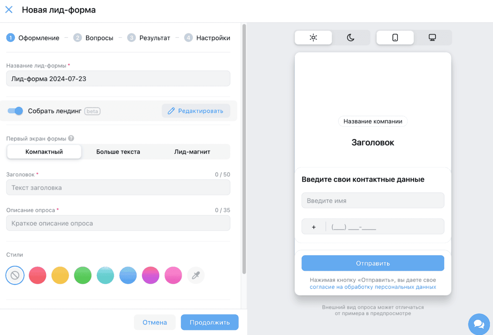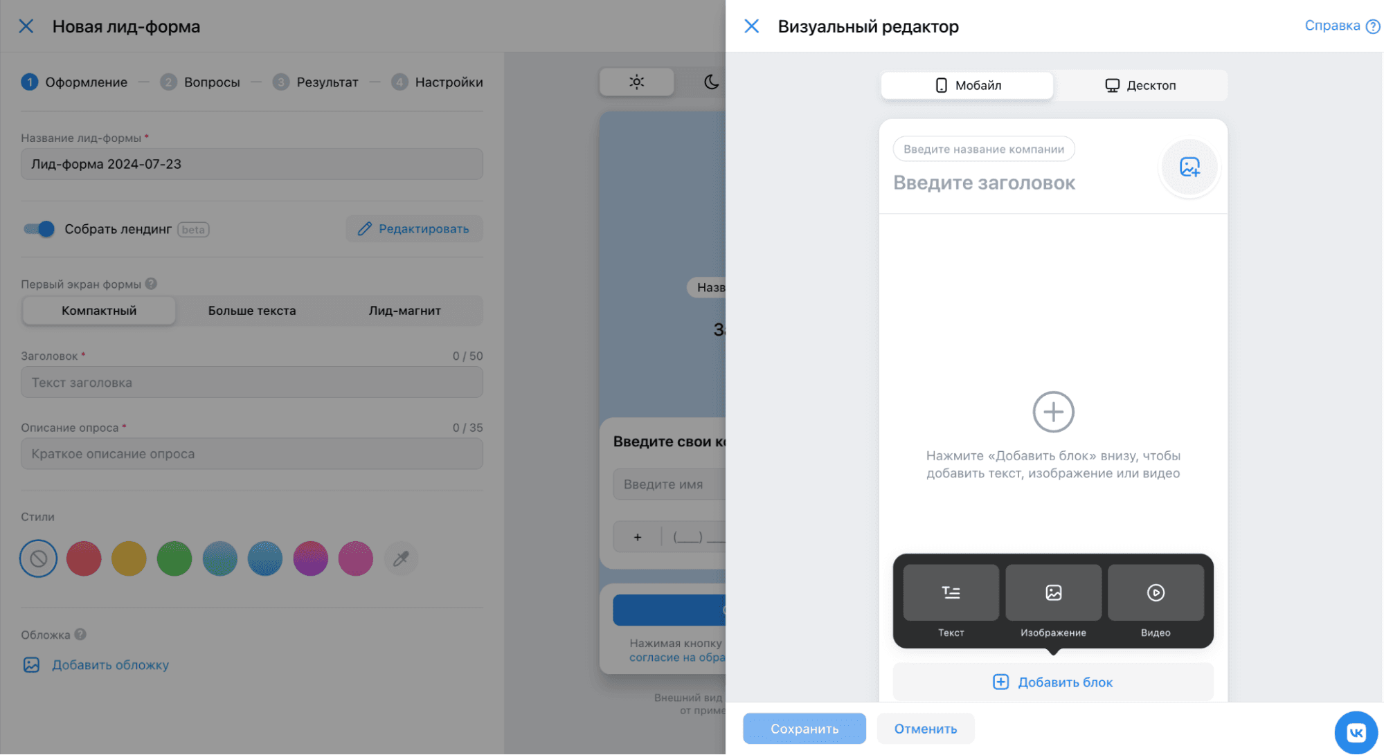 Создание посадочной страницы происходит в рекламном кабинете. Нужно выбиратьопцию при создании или редактировании лид-форм. В частности, указать «Собратьлендинг» и загрузить изображения, видео и тексты, а также добавить кнопкупризыва к действию.