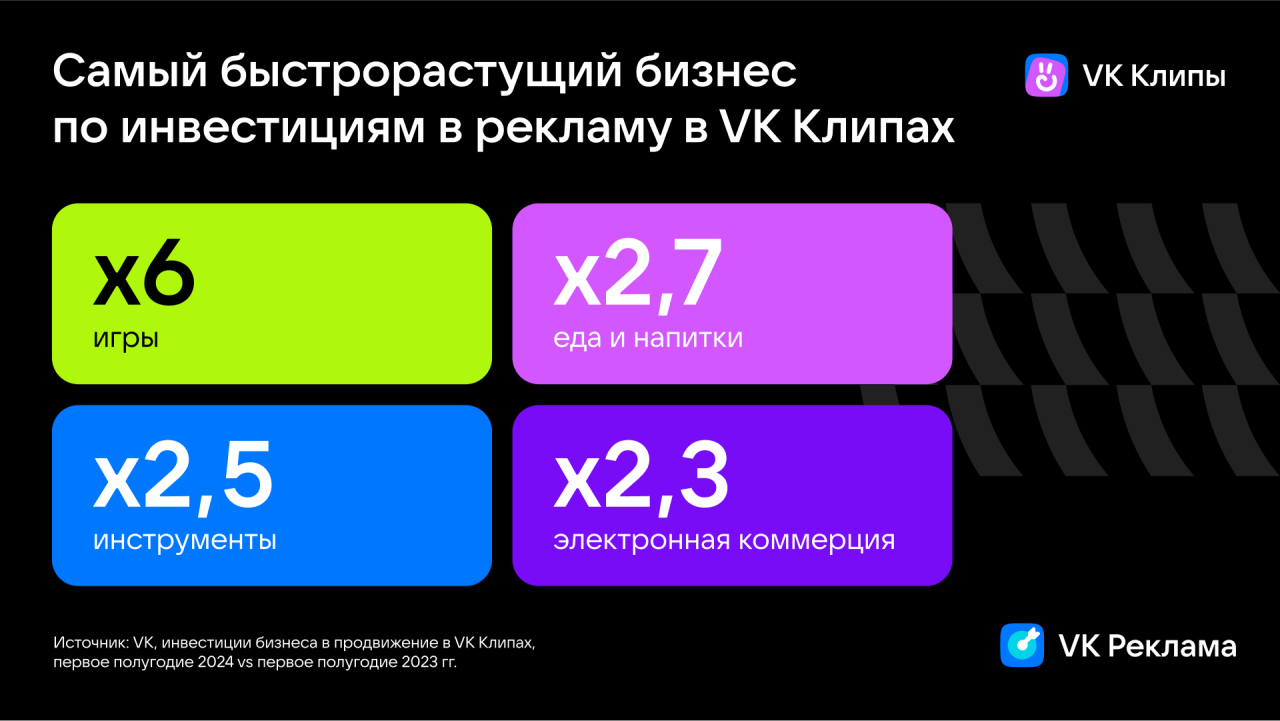 У финансовых компаний самый высокий средний чек на рекламу в «VKклипах» среди бизнеса. Второе место заняла категория «инструменты», третье— «игры». Последние активнее других за год увеличили бюджеты на промо ввертикальных роликах — в шесть раз. В топ продвижения бизнеса по ростуинвестиций вошли «еда и напитки», «инструменты» и электронная коммерция,сообщили в пресс-службе VK.