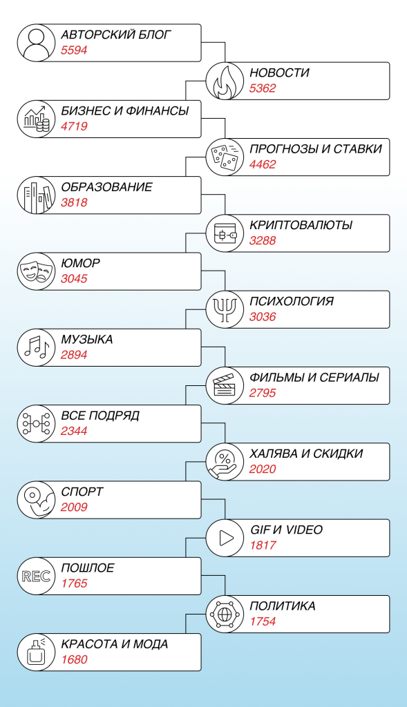 В топ-3 самых крупных тем по количеству каналов (без учета географическойтематики) вошли: «Авторский блог» (5,6 тыс.), «Новости» (5,4 тыс.), «Бизнес ифинансы» (4,7 тыс.).