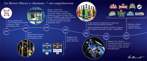 Leo Burnett сотрудничает с «Балтикой» 2007 года. Этим летом агентство выиграло тендер на обслуживание еще восьми брендов компании. Среди них два национальных: Zatecky Gus и «Арсенальное» (ранее обслуживались в BBDO Moscow), и шесть региональных: «Невское» (также вело BBDO), «Дон», «Сибирский бочонок», «Самара», «ДВ» и «Уральский Мастер».