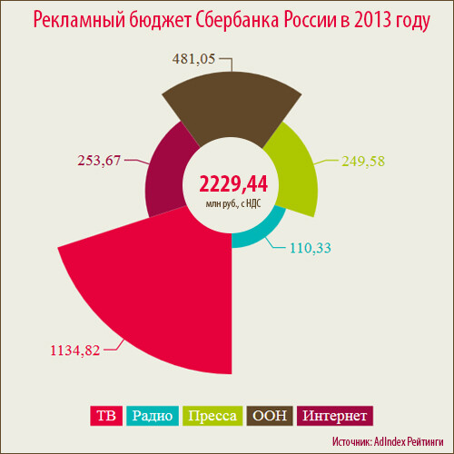По оценке AdIndex Data Center, Сбербанк расположился на 25 строчке TOП-100 крупнейших рекламодателей 2013 года и возглавляет рейтинг в сегменте «финансовые услуги» с бюджетом в 2,2 млрд рублей.
