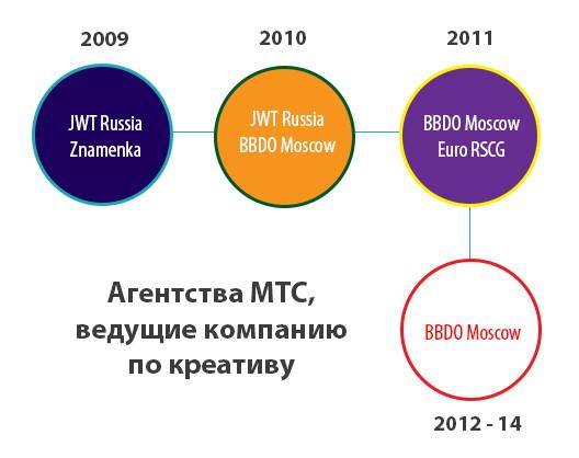 В 2009 году креативным обслуживанием МТС занимались агентства JWT Russia и Znamenka. С 2010 года и по настоящее время эти услуги для оператора оказывало BBDO: в 2010 году – наряду с JWT Russia, в 2011 – с Euro RSCG.