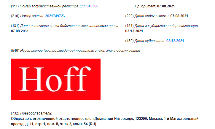 В прошлом году компания «Домашний интерьер» зарегистрировала в Роспатентеновыйлоготип Hoff, а также подалазаявку на регистрацию товарного знака в новой для себякатегории — косметические средства и парфюмерия.