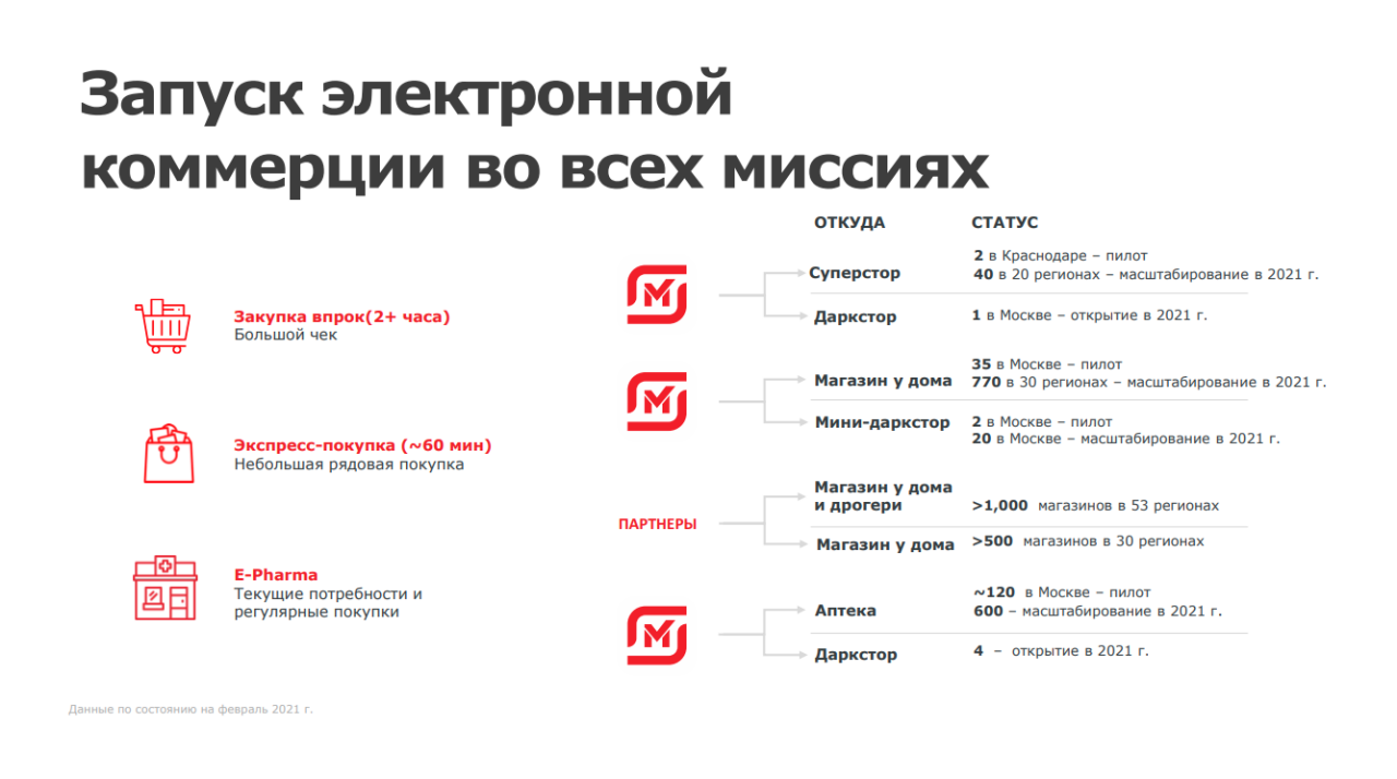 На конец первого квартала 2021 г. сервисы e-commerce охватывали более 1300магазинов сети в 58 регионах и 94 городах. Ежедневно «Магнит» выполняет около9500 заказов в день, при этом средний чек собственной доставки почти в 3,8 разапревышает аналогичный в офлайн-магазинах — 1400 руб. против 372 руб. В текущемгоду компания планирует расширить онлайн-доставку, добавив не менее 1500магазинов у дома, дрогери и широкоформатных магазинов в более чем 50регионах.