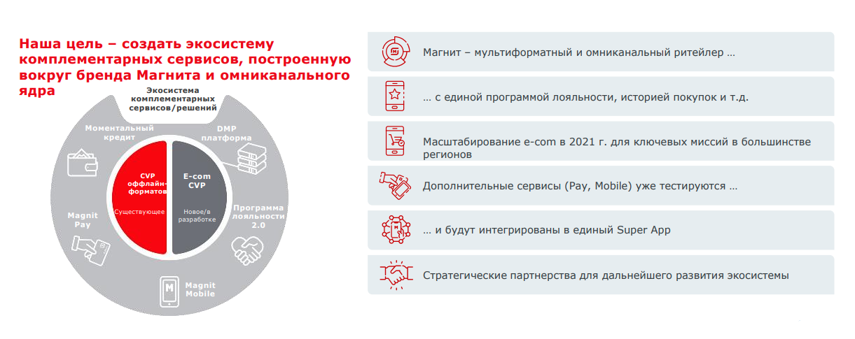 Согласно последней квартальнойотчетности «Магнита», в краткосрочной перспективе ретейлернамерен развивать направление e-com и заключать расширенные партнерства, а втечение 3–5 лет планирует занять лидирующие позиции в сфере электроннойкоммерции за пределами e-grocery. До 2025 г. компания создастe-grocery-платформу, интегрированную в омниканальный покупательский опыт испособную поддерживать более 5% оборота «Магнита», говорится в документе.