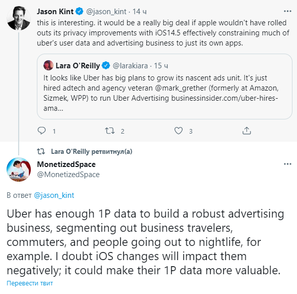 В комментариях к посту CEO Digital Content Next Джейсона Кинта пользователиотмечают, что основой рекламного бизнеса Uber может статьогромный объем first-party-данных. Они позволят сервису сегментироватьаудиторию для рекламодателей, и на фоне ограничений iOS такие данные станут ещеболее ценными для рынка.