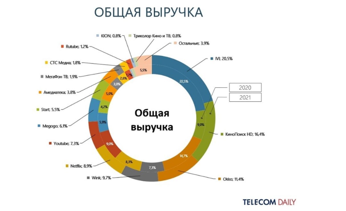 Сервис more.tv принадлежит «СТС Медиа», по итогам 2021 г. доля компании вобщей выручке онлайн-кинотеатров составила 1,8%, по подсчетам Telecom Daily,годом ранее показатель был выше почти в полтора раза — 2,6%.