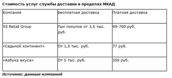Ежемесячный рост интернет-продаж в «Азбуке вкуса» составляет около 20%. «Это обусловлено, с одной стороны, жизненным циклом проекта — он существует только 11 месяцев, то есть наблюдается «эффект низкого старта», а с другой — существующей инфраструктурой», — рассказывает пресс-секретарь сети Андрей Голубков.Средний чек в службе доставки составляет 5,5 тыс. руб., при этом процент постоянных покупателей достигает 70%. При обычных походах в магазин компании граждане тратят порядка 1,3 тыс. руб. Доставку сеть предоставляет бесплатно для живущих в пределах МКАД при заказе от 5 тыс. руб., при меньшем заказе за нее придется заплатить 350 руб. Для живущих за МКАД расценки немного другие: продукты привезут бесплатно, если их заказали на сумму выше 10 тыс. руб., 500 руб. — если заказ меньше.