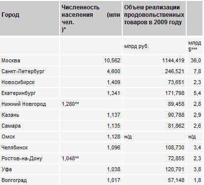 По итогам 2009 года рынок продовольственных товаров в России оценивается в 6,425 трлн руб. Самые большие рынки — в Центральном и Приволжском федеральных округах (2,176 трлн и 1,153 трлн руб. соответственно), наименьший — в Дальневосточном округе (279 млрд руб.). На продовольственный рынок Москвы приходится 17,8% (1,144 трлн руб.) всех продаж, что примерно в пять раз больше показателя Санкт-Петербурга (246 млрд руб.; см. таблицу).