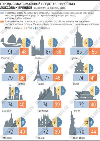 Согласно данным международной консалтинговой компании CB Richard Ellis, Москва по итогам 2009 года заняла девятое место, разделив его с Миланом и Токио, в рейтинге самых привлекательных мировых городов с точки зрения экспансии люксовых брендов (см. рисунок). При этом объем всего одежного рынка в России в сравнении с 2008 годом сократился на 8%, до €31,5 млрд, подсчитала Fashion Consulting Group. Больше всего в кризис пострадал именно премиальный сегмент (около 15% рынка), продажи которого упали на 20-40%.