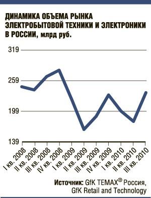 В течение 2010 года рынок набирал обороты, и за девять месяцев прирост продаж составил 7,2% по сравнению с тем же периодом прошлого года, отмечают аналитики «ГфК-Русь». Наиболее успешными оказались результаты третьего квартала, когда объем российского рынка превысил уровень самого успешного в прошлом году четвертого квартала. Это говорит о выходе из кризисного периода, считают в агентстве. Особенно выросли продажи ноутбуков и нетбуков, цифровой техники, коммуникаторов, букридеров и цифровых телевизоров, говорит г-н Гуськов. Третий квартал 2010 года стал переломным для ритейла, соглашается PR-менеджер «М.Видео» Антон Пантелеев: «Вернулся покупательский оптимизм, вырос спрос на кредиты. Уже к августу мы зафиксировали возвращение кредитных продаж на докризисный уровень — 20%. А в некоторых регионах в период проведения акций уровень продаж в кредит достигает 60%».