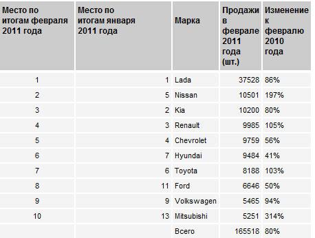 Первое место по продажам иномарок в России занял бренд среднего класса, причем это не Toyota, традиционно имевшая сильные позиции в стране (в сентябре 2008 года, в самом начале кризиса, она даже возглавила рейтинг), а также японский Nissan. По итогам первых двух месяцев первое место среди иностранных брендов, как и в январе, удерживает Kia. Прошлогодний лидер Chevrolet продолжает терять позиции. В феврале он опустился на четвертое место, уступив Nissan, Kia и Renault.