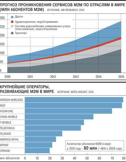 М2М в мире начали развиваться раньше, чем аналогичные сервисы пришли в Россию. По прогнозам Berg Insight, совокупная выручка от предоставления M2M-услуг в мобильных сетях в мире по итогам 2008 года составляла €3 млрд, а к 2012 году должна достигнуть порядка €8,9 млрд. Средний ARPU (ежемесячный счет на одного абонента) сервиса по выборке из 15 крупных европейских компаний колеблется от $2 до $15 в зависимости от вида услуги. В МТС ARPU сим-карты, работающей в системе М2М, составляет в зависимости от сервиса от 50 до 300 руб. В 'Вымпелкоме' и 'МегаФоне' свои показатели не раскрывают.