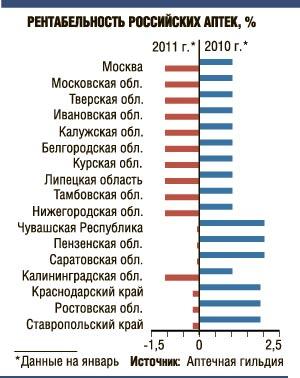 По данным Аптечной гильдии, рентабельность аптек ушла в минус по всей России и это коснулось всех участников рынка. «Особенно плачевная ситуация в регионах, а также у государственных и муниципальных аптек», — говорит исполнительный директор гильдии Елена Неволина. По данным организации, если в январе прошлого года рентабельность аптечного бизнеса в различных регионах колебалась от 1,03 до 2,03%, то в этом январе — от минус 0,2 до 1,7% (см. таблицу). Объяснение этому одно, говорит г-жа Неволина, — увеличение налогового бремени. Страховые выплаты с 1 января 2011 года выросли с 14 до 34%, их доля в общем товарообороте аптек достигла 3,57% (1,37% ранее). Кроме того, аптеки с численностью штата более 100 человек (это 80% аптечных организаций) лишились возможности использовать единый налог на вмененный доход. Увеличились также издержки за счет роста коммунальных платежей, аренды и эксплуатационных расходов, добавляют в Аптечной гильдии. При этом снизился средний чек из-за того, что платежеспособность населения в регионах до сих пор не восстановилась. Самая высокая рентабельность у аптечных организаций прежде составляла 2%, и этого не хватило, чтобы покрыть рост налогового бремени, подтверждает исполнительный директор Российской ассоциации аптечных сетей (РААС) Нелли Игнатьева.