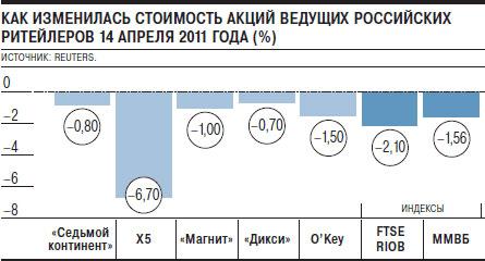 Вчера капитализация Х5 на LSE упала на 6,7%, до $10,39 млрд. Акции дешевели и у других российских продуктовых ритейлеров (см. график). 'Подтвердились опасения насчет серьезных структурных изменений на рынке — усилившаяся ценовая конкуренция между ритейлерами оказывает сильное давление на их маржу',— объясняет госпожа Загвоздина.